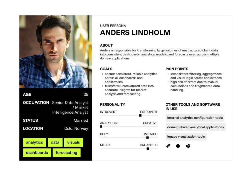 Creating a clear profile of data analysts and product stakeholders responsible for configuring analytics, validating data, and using dashboards to support market analysis and decision-making.