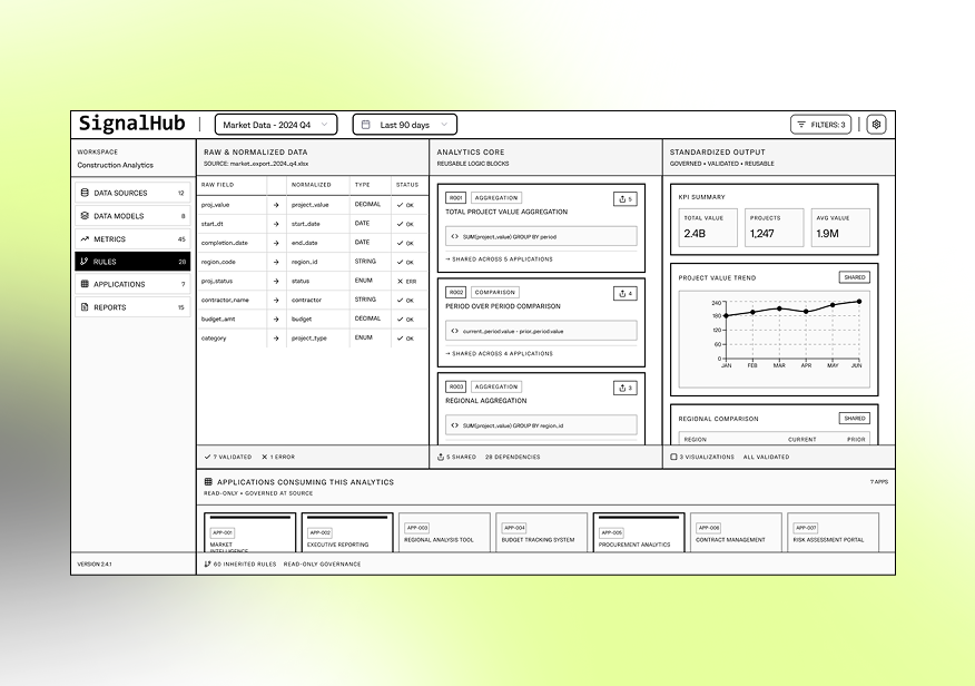 Our client needed a reliable foundation to support market analyses, forecasts, and decision-making in the construction and property sectors. Computools developed MetricPillar – a centralized analytics framework that standardizes data processing, calculations, filtering logic, and visualization rules across a growing ecosystem of analytical applications.