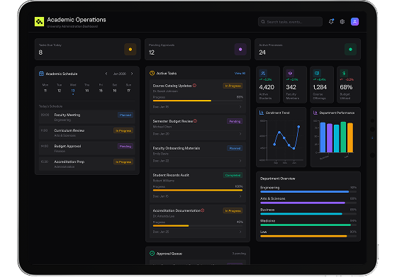 Powered by unified academic, administrative, and performance data with real-time visibility, automated approvals, and workflow orchestration that reduce delays, eliminate manual coordination, and accelerate execution.