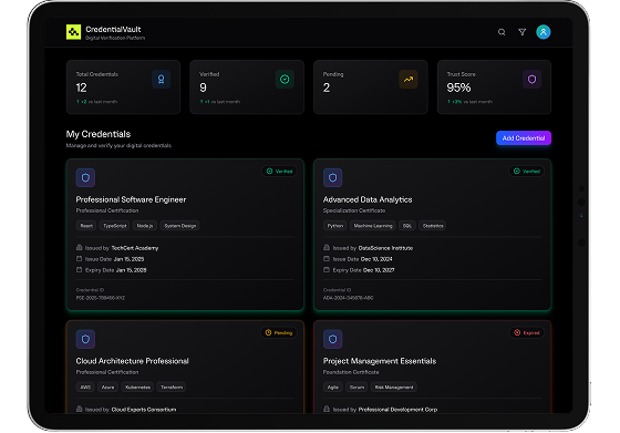 We build credential issuance and verification infrastructure for certificates, micro-credentials, qualifications, and professional awards, including fraud-resistant verification flows. By leveraging AI and ML adoption for intelligent validation and automated credential assessment, we enable new monetization models, simplify verification processes, and significantly reduce administrative overhead.