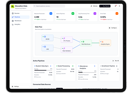 Our engineers deliver data engineering services for educational organizations to unify SIS, LMS, assessment, credentialing, and finance data into a reliable analytics layer. This enables consistent KPIs, audit-ready reporting, and near real-time dashboards for retention tracking, capacity planning, performance monitoring, and institution-wide strategic planning.
