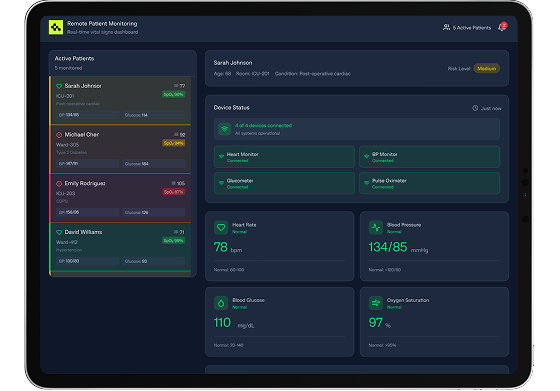 We build provider-focused RPM platforms that integrate wearables, sensors, medical devices, IoMT and AIoT technologies into a unified clinical monitoring ecosystem. Real-time dashboards, automated alerts, and device-driven analytics give healthcare teams continuous visibility into patient health, enabling earlier interventions and reducing hospital readmissions.