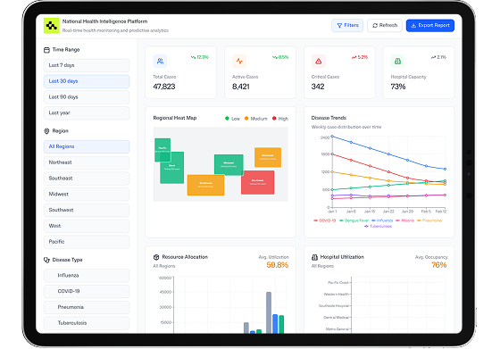 Our team designs custom AI-powered regional health intelligence platforms that unify clinical, environmental, and population-level data to give health authorities a real-time view of community health. By aggregating anonymized medical records, lab results, imaging data, wearable metrics, epidemiological inputs, and environmental signals, our platforms deliver large-scale predictive analytics that enhance healthcare delivery and regional planning.
