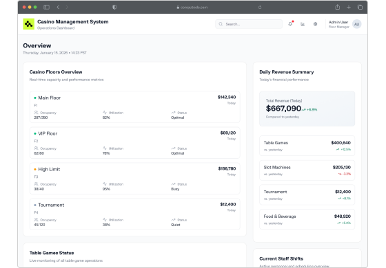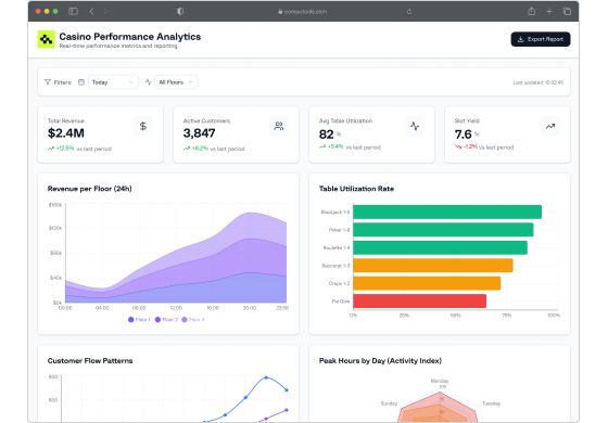 Driven by centralized slot, table, loyalty, and cage data with real-time dashboards and automated workflows that reduce manual effort, speed up approvals, and keep the floor performing.