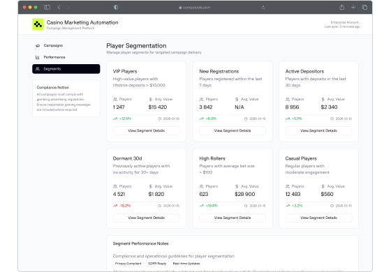Computools crafts custom platforms that manage casino promotions, tournaments, player offers, loyalty incentives, and multi-channel marketing campaigns, driven by real-time player behavior, segmentation, and performance data. These systems support personalized engagement, automated campaign execution, cross-property consistency, helping casinos increase player retention, spend, and lifetime value.